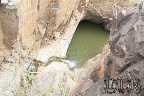 سرنا حتى وصلنا هذه البركة العميقة لتقول لنا انتهى الطريق حيث صعب علينا اجتيازها بسبب البلل وتملس الصخر فأخذنا فيها بعض الوقت للسباحة هنا عزمت أنا والأخ خالد على إيجاد طريق للمواصلة ... بينما الأخ إبراهيم عاد إلى السيارة ببعض الأغراض التي قد تثقل علينا فقررنا صعود إحدى الحافتين