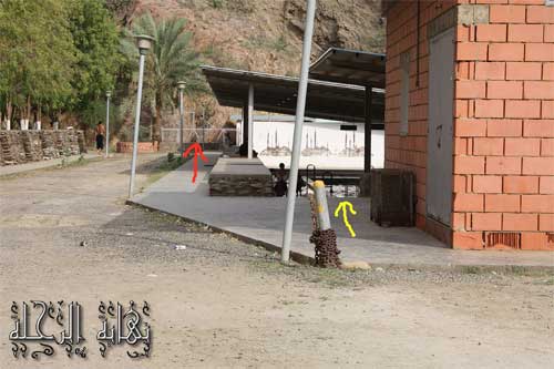 صورة من الداخل لحوض الاستحمام الذي يقلل من حرارة المياه والذي يشير إليه السهم الأصفر .. راعيت في الصورة مشاعر الزوار لذلك أخذتها من بعيد ... والسهم الأحمر يشير إلى موقع خروج المياه الحارة من جوف الأرض