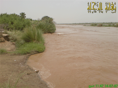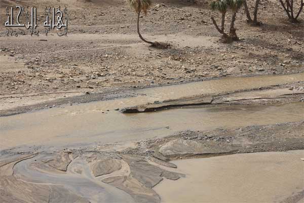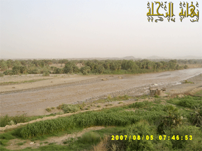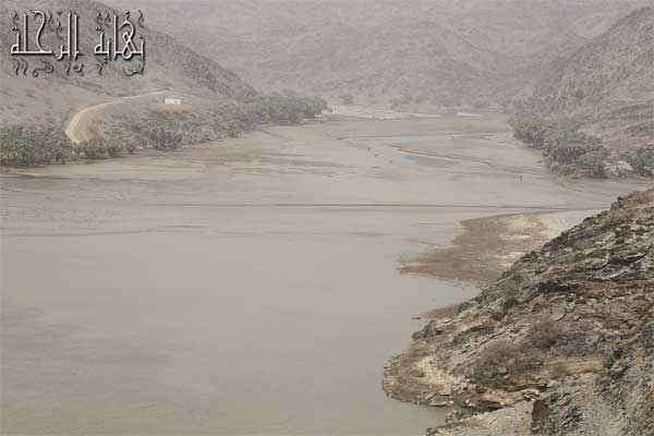 صورة لمجرى الوادي بعد إقامة السد ونلاحظ جفاف الأرض وقلة الغطاء النباتي وانتشار الرمال