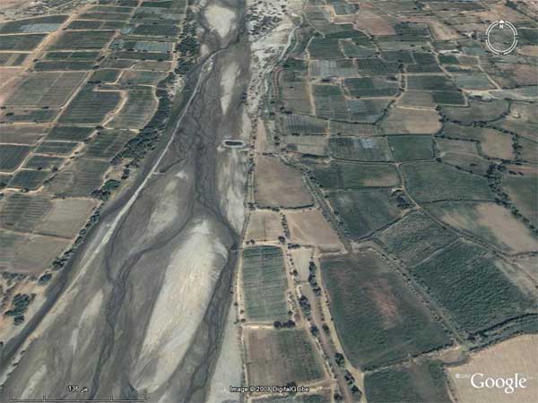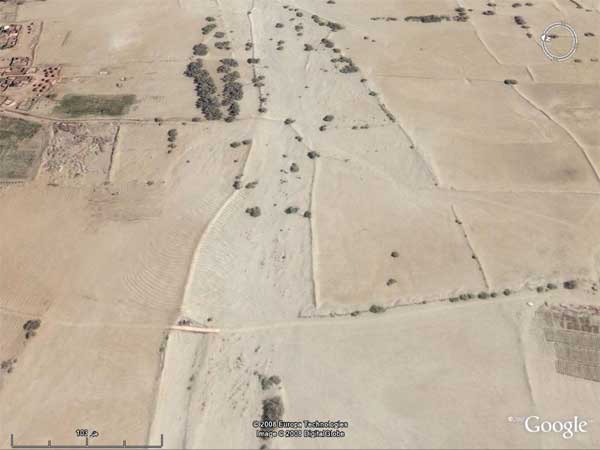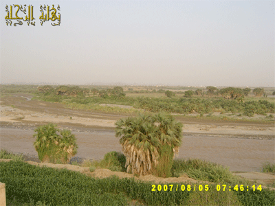 صورة لمجرى الوادي بعد إقامة السد ... ونلاحظ كيف دفنته الرمال ... ولم يبقى من المزارع سوى القليل تعتمد على الآبار السطحية