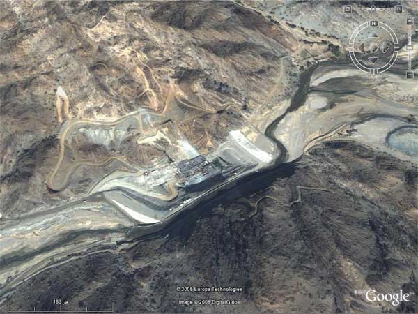صورة جوية توضح موقع إنشاء السد ... حيث الدائرة الحمراء من الملاحظ أن السد أقيم خارج منطقة السهل عند عنق الزجاجة حيث يلتقي به آخر روافده الكبيرة وادي الحياة ليسهل بنائه وتقل كلفته ... ولضخامة هذا الوادي الذي يرفده أكثر من 90 رافداً بعضها يأتي من اليمن ... ومن وجهة نظري أن موقع إنشائه الذي يعتبر في المنطقة الجبلية سيساعد على موت أكبر عدد من الحياة الطبيعية للنبات والحيوان والمزارع ... وستكون كميات المياه التي تختزن في جوف الأرض أقل بسبب صلابة المنطقة وتكدس أطنان الطمي في قاع البحيرة خلفه.