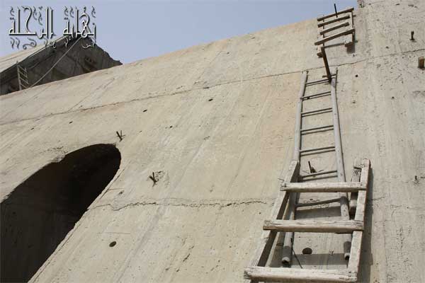 صورة للافتة المشروع والتي تبين السعة التخزينية للسد والتي بلغت 193 مليون م3 وارتفاع السد عن الأساسات والذي بلغ 106م والطول عند القمة والذي بلغ 340م وكمية الخرسانة المستهلكة والتي بلغت 710910 م3 عندما وصلنا إلى السد وجدنا أنه في مراحله الأخيرة من البناء وقد بدأ بخزن الماء من ورائه ... فرغبنا في أن نتجول فيه ... فتوجهنا إليه ... وأوقفنا سيارتنا قربه ولم نرى أمامنا سوى جبل خراساني شاهق وعليه بعض السلالم التي يستخدمها العمال ... فصعدناها والتقينا بأحد العمال وصحبنا في رحلة داخل دهاليز السد التي أمضينا فيها قرابة 3 ساعات ونحن نسير بداخله .. إلى أن وصلنا إلى قمته ورأينا الجهة الأخرى التي بدأت تتكون فيها البحيرة ... والترسبات الطينية التي ستدفن جزء كبيراً من قاع تلك البحيرة خلال السنوات القادمة.