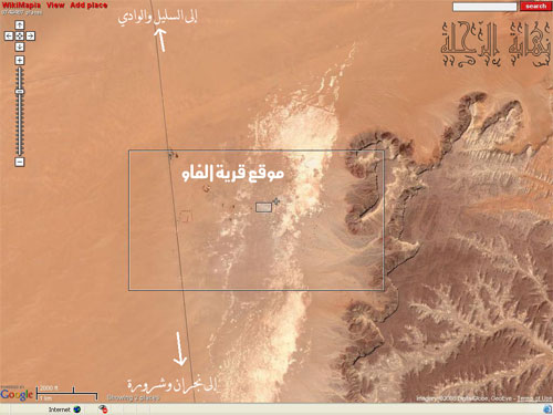 رحلتي إلى تلك القرية الأثرية قبل سنة تقريباً كنت خارجاً من نجران بعد زيارتي لموقع الأخدود ... وكنت أنوي المرور على قرية الفاو قبل أن تغيب الشمس ... ولكن مع الأسف الشديد تأخرت ولم أصل إلى القرية إلا بعد غياب الشمس ... وكان السبب هبوب العواصف الرملية التي أبطأت السير ... وخروجنا المتأخر من نجران ... وعندما وصلنا الموقع قبل العشاء بقليل وجدناه محاطاً بسياج يمتد من الشمال إلى الجنوب لمسافة طويلة ... ووجدنا بيتاً قريباً منه في أعلاه هوائي إرسال فظنناه حارساً أو ما شبه ... ذهبنا إليه فوجدناه شيخ طاعن في السن يتوضأ لصلاة العشاء ... وأخبرناه أننا نريد دخول المنطقة الأثرية ... فعجب لأمرنا ولتوقيتنا ... وقد طلب منا أن - نمرح - عنده إلى الصباح .... ولكن أظهرنا له العجلة من أمرنا ... فأخبرنا أن نسير مع السياج مسافة 700م وسنجد مدخلاً فتحَ عنوة ... وقال : إذا دخلتوا اعكسوا الاتجاه حتى تحاذون بيتي وستجدونها هناك ... - وإن بيتوا القعود للصباح فاقعدوا - قال ذلك تعجباً منه لموقفنا ... والجدير بالذكر أن قرية الفاو هي قرية مدفونة بالكامل تحت الأرض ولم يحفر منها إلا القليل والباقي ترك وأحيط بشبك طويل ... وأعتقد والله أعلم أنها تمتد لمسافات كبيرة تحت الأرض نحو الجنوب مما تم حفره ... لأن الذي يسير على الأرض يشعر باهتزازاتها تحت قدميه ... ومن خلال الصورة الجوية التالية ... ستتضح الرؤية ... فاللون الأبيض الذي يمثل الطمي والدفن يمتد لمسافات طويلة جانب الطريق ... والجزء الذي حفر يقع في طرفه الشمالي فقط ...
