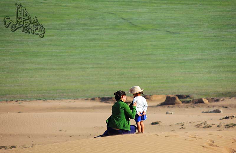 امرأة تقود طفلتها وتسيران نحو الرمال الجميلة