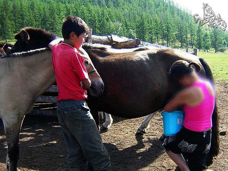 امرأة وأخاها تحلب الخيل .. حيث يعتبر من أهم مشروبات لديهم