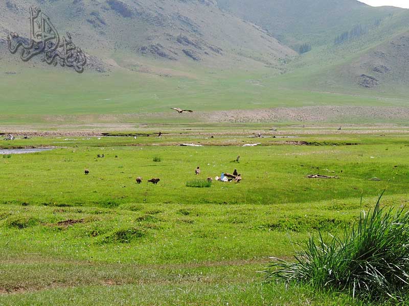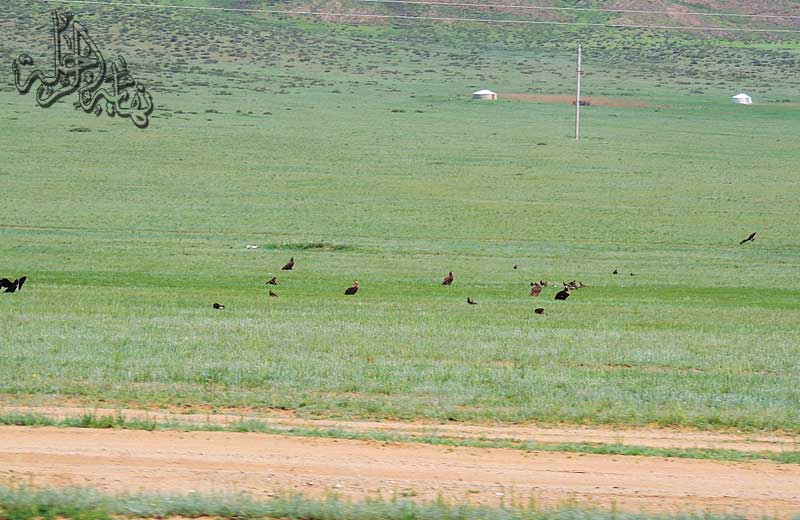 العقبان والنسور والصقور وغيرها من الجوارح تنتشر بشكل واسع في براري منغوليا، لعل من أنفسها الصقر الحر الذي يتواجد حيث يتواجد فأر الأرض