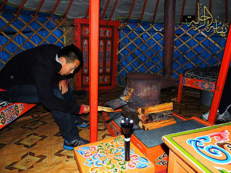 مرافقي بعد أن استأجرنا خيمة يوقد النار لكي نتدفأ من شدة البرد