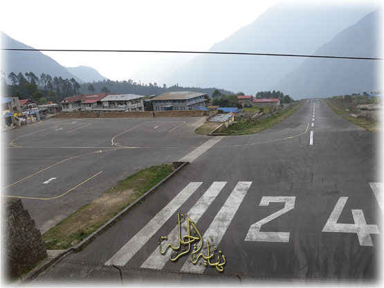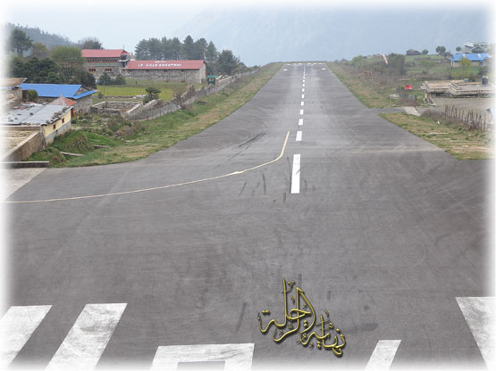 أقلعت بنا الطائرة بسرعة 360كم في الساعة وكان معي على متنها حوالي 15 راكباً كلهم من الجنسية الغربية وقليل من النيبالية وخلال 40 دقيقة هبطنا في أعلى مطار رأيته في حياتي في قرية لوكلا LUKLA التي ترتفع عن سطح البحر أكثر من 2880م ... وقد كان مدرج الهبوط قصير جداً لا يتجاوز 200متراً مما يبعث الخوف في داخلك... ولكنه يسمح بهبوط الطائرة بسرعة وكفاءة عالية بسبب انحداره الذي يجعل الطائرة بعد الهبوط تبدأ عملية الصعود التي تساعدها على سرعة الفرملة ولعل الصورة تغني عن الوصف...