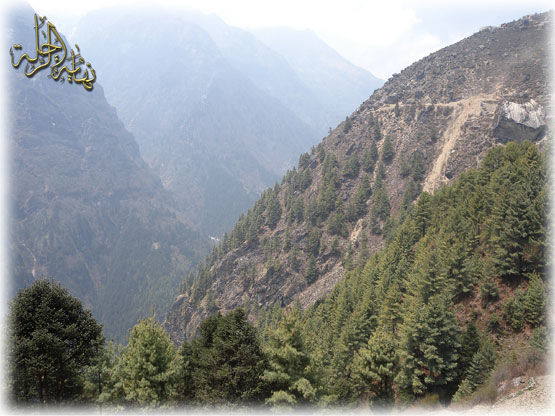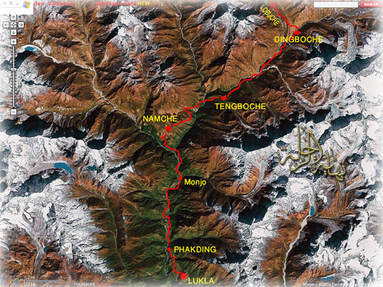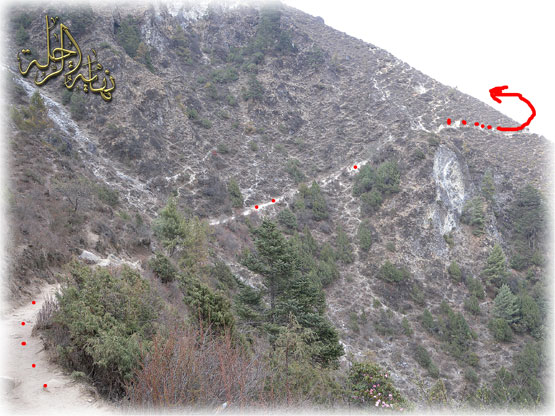 في الطريق من قرية نامشي إلى تنقبوتشي ثم دنقبوتشي ثم لوبتشي ... لم ألتقط العديد من الصور والسبب هو تشابه الأرض وتناقص الغطاء النباتي وظهور الثلوج ... لذلك اكتفيت ببعض الصور التي سأعرضها لكم ومن خلالها نواصل سيرنا إلى نهاية الرحلة بالقرب من جبل إفرست أقرب نقطة يمكن الوصول إليها دون استخدام المعدات أو الأكسجين أو التمرين على التأقلم وهي قرية لوبتشي الظاهرة على الخريطة أعلاه ... أتركم مع الرحلة إلى هناك