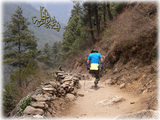 هذا رجل من هولندا قابلته بعد أن قطع 15كم سيراً على قدم واحدة وعكازيتين .. أوقفته وألقيت عليه التحية وأخذت أحدثه عن اسمه وبلده وما أصابه وما دفعه على هذا ... فأجابني بالإنجليزية ... عمره 53 سنة أصيب في حادث قبل 20 سنة وهو من سكان هولندا ... كان يحلم منذ صغره أن يرى قمة إفرست على الطبيعة ... وأنه حان الوقت ليحقق حلمه .... فعجبت له ولقوة الإرادة التي يملكها ... في حين الكثير منا لا يعرف معناها أو حتى معنى لفظ إرادة وعزيمة ... احترمته كثيراً ... وحدثته عن نفسي وبلدي فسعد كثيراً عندما قال لي أنت أول عربي سعودي أقابله وأتحدث إليه ... ودعته وذهبت، ومراعاة لمشاعره لم أجرؤ على تصويره وهو ينظر فألتقط له هذه الصورة عندما ذهب لتكون شاهداً على هذه الرسالة التي أتمنى أن يستفيد منها قارئها.