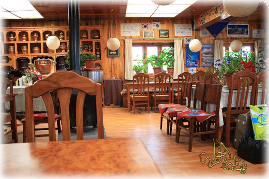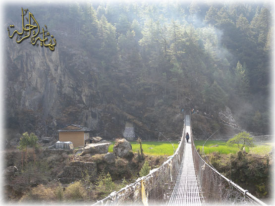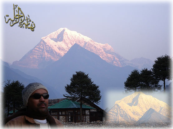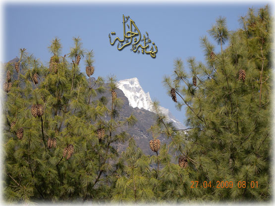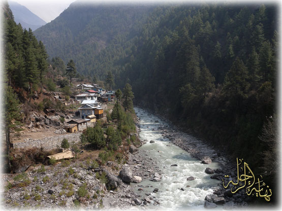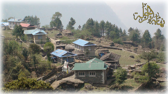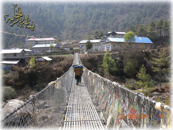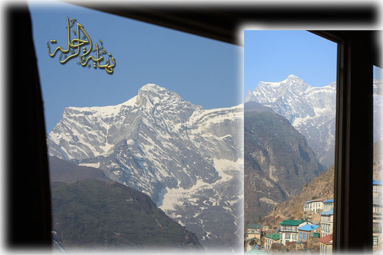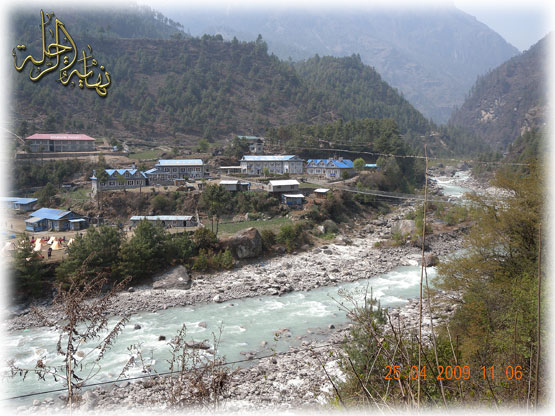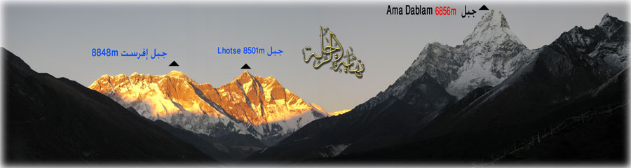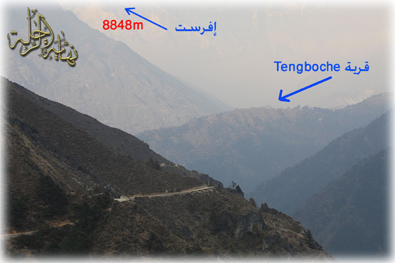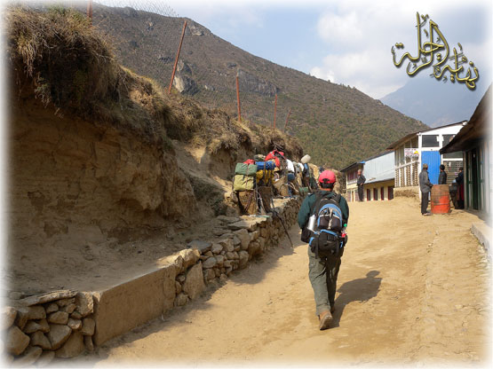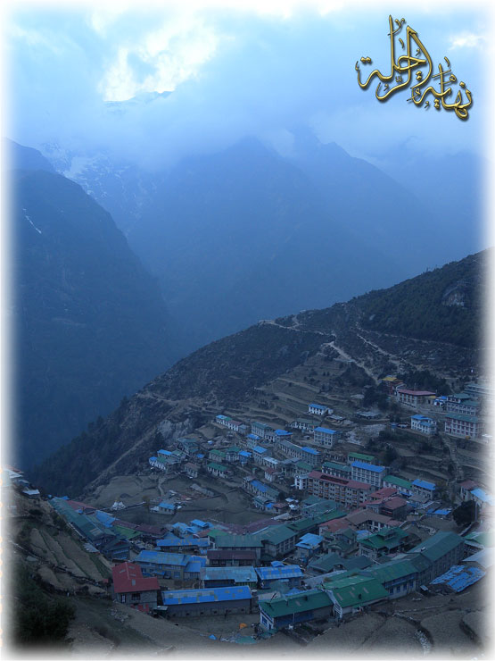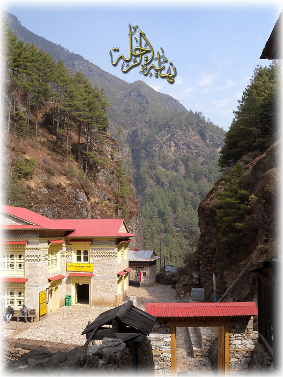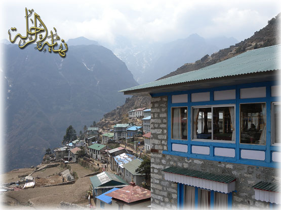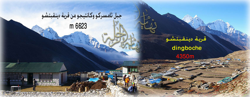 قرية NAMCHE قرية جميلة تقع على ارتفاع 3450م فوق مستوى سطح البحر ... ومناخها معتدل إلى بارد صيفاً ... وتغطيها الثلوج معظم أيام الشتاء .. وهذه القرية تقع في مكان جميل على جبل تحيط به أخاديد سحيقة ... ويحتضن هذه القرية الجميلة قوس من الجبال جعلها متميزة وذات إطلالة جميلة حيث يمكنك منها مشاهدة أكثر القمم ارتفاعاً في العالم تحيط بك من كل جانب ... وإلى أن يبزغ فجر الصباح أنتقل معكم في الجزء الثاني من رحلة السير على الأقدام. المرحلة الثانية الجزء الثاني : من نامشي إلى دينقبيتشي FROM NAMCHE TO DINGBOCHE بت ليلتي في هذه القرية في فندق صغير وجميل أجرته لليوم الواحد 1.30 دولاراً فقط .. وفي الصباح عند الخامسة والنصف بعد الفجر تناولت إفطاري في مطعم الفندق وخرجت ألقي نظرة من حولي فدهشت لما رأيت من جمال المنظر من كل جانب... أود أن أوضح بأن سعر الطعام في هذه القرية يرتفع عن قرية لوكلا بسبب سعر النقل إلى هنا ... ولكنه يبقى مقبولاً بالنسبة لنا. والمسافة التي سجلتها في جهازي إلى هذه القرية وهي مسافة سير في طريق متعرج صعوداً ونزولاً عبر سلاسل متعددة حوالي 21كم قطعتها في 11 ساعة بمتوسط سير يقدر بحوالي 1.9كم لكل ساعة.
