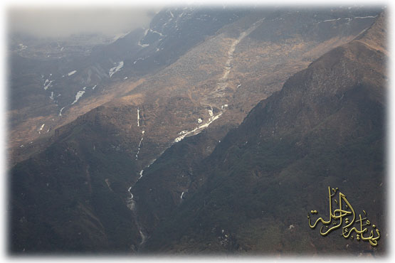 صورة للنهر الذي أصبح في العمق بعد أن ارتفعنا عنه كثيراً ونلاحظ بداية اختفاء الغطاء النباتي بسبب شدة البرودة ... متوسط ارتفاع النهر عن البحر حوالي 3100م وارتفاع موقع الصورة حوالي 3900م