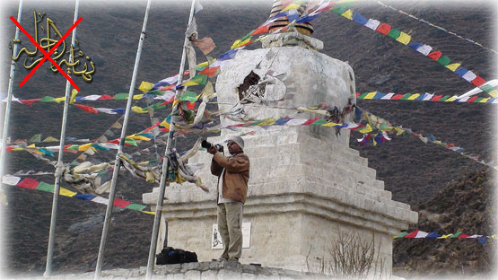 كثيراً ما نمر بهذه المعابد التي تعترض الطريق على شكل دوار ... وقد لاحظت من مرافقي سلوكه المسار الأيسر إجباري من الناحية العقدية لديهم ... بينما كنت أخالفه ذلك فأسلك المسار الأيمن ... وكان دائماً يسألنا لماذا أفعل ذلك فأخبرته أن ما تراه شعيرة يخصك ولا يخصني ... وقد دار بيني وبينه نقاش حول بوذا ومن خلق الأرض والجبال ... وأخبرني أن بوذا هو من خلق هذه الجبال ... ولعدم إتقاني اللغة جيداً ... اكتفيت بتوجيه سؤال له واحد ... إذا كان بوذي كما تقول يسكن هذه الجبال التي التي تدعي أنه إلاهها وقد كان فيها منذ زمن ... فمن خلق الشمس والقمر والنجوم هل بوذا من فعل ذلك ... فكر قليلاً وستعرف أن هناك من هو أعظم مما تتصور ومما تفكر ... وهو الله الذي خلقنا وخلق السماوات والأرض وخلق الموت والحياة .... فسكت ولم يعد يحدثني عن الدين بعد ذلك ... ولا أدري أكان سكوته غضباً مني أم حيرة في أمره ... إلا أني سعدت بقوله لي بعد برهة سأقرأ عن الإسلام ... إذا وجدت فرصة لذلك .