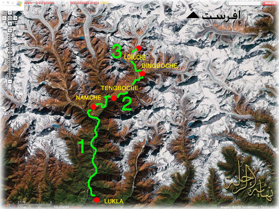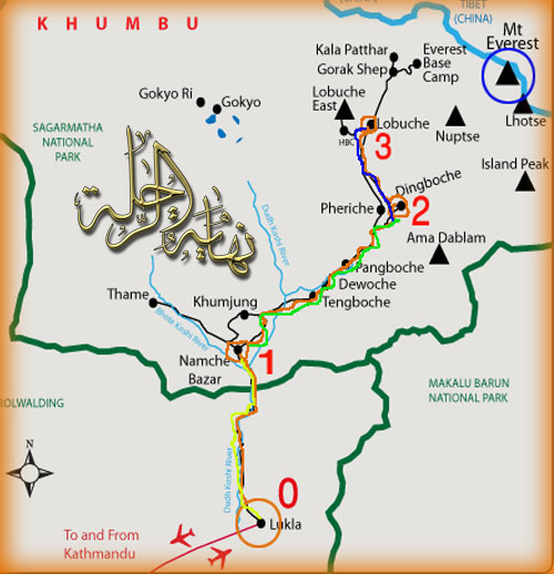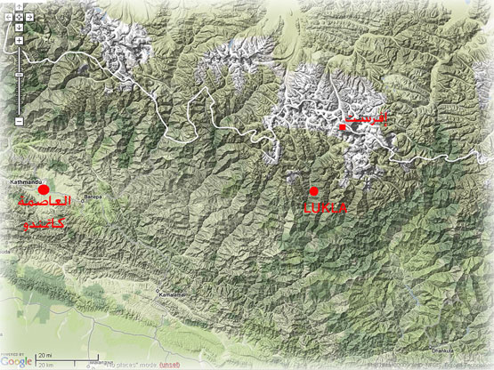 المرحلة الثانية 63كم سيراً على الأقدام من قرية لوكلا إلى أقرب نقطة نحو إفرست ملاحظة : لا يمكن مشاهدة جبل إفرست والجبال ذات القمم العالية من قرية لوكلا ، وذاك هو السبب الذي دفعني إلى رحلة السير نحو قرية نامشي وما بعدها لكي أشاهد تلك القمم والمناظر الجميلة. حيث يتعذر رؤية إفرست وما حولها من هذا المكان أو غيره بسبب الجبال المعقدة والسلاسل التي تحجبها في الخلف ... لذلك لا مفر من رياضة السير على الأقدام لرؤيتها إلا بركوب الطائرة الهليكوبتر وذلك مكلف للغاية. وقد سألت عنه ووجدتها تكلف الساعة الواحدة 1.800 دولار. الجزء الأول : من لوكلا إلى نامشي قرية LUKLA الصغيرة القرية التي لا تصلها السيارات هي أقرب قرية تعرف المواصلات الحديثة نحو إفرست حيث الطائرة فقط تصل إليها ... منها بدأت رحلة سيري على الأقدام عبر سلاسل جبلية وعرة وجداول نهرية جارية مسافة 63كم ارتفعت خلالها من علو 2880م إلى علو 4930م حوالي 2050م . وسأبدأ معكم هذه الرحلة مصحوبة بالخرائط التفصيلية التي وضحت عليها مراحل السير ... خلال طريق السير على الأقدام مررت بالعديد من القرى الصغيرة كان من أهمها قرية باكدين ومونجو ونامشي وتنقبوتشي ودينقبوتش ولوبوتشي التي اعتبرتها أقرب نقطة نحو إفرست تمكنت من الوصول إليها ... حيث أن الطريق بعدها يتعذر سلوكه دون اتخاذ احتياطات لازمة من معدات التسلق والثلج والتمرين الوقائي من صعود ونزول لعدة أيام حتى تتكيف رئتي الإنسان وجسمه على الأكسوجين القليل هناك .... ولأن هدفي الذي رسمته فقط كان الوصول إلى أقرب نقطة نحو إفرست وصولاً طبيعياً اكتفيت بجعل نقطة قرية لوبوتشي هي آخر نقطة أصلها على ارتفاع ناهز 5000م فوق سطح البحر ... استمتعت كثيراً برياضة السير على الأقدام ... وبما شاهدته من مناظر طبيعية وتدرج للغطاء النباتي حتى اختفى جله في علو4000م فما فوق ، وما أدهشني أكثر ما رأيته من تكيف السكان هناك وبأسهم وقوتهم وجبروتهم في حمل الأثقال على ظهورهم ...