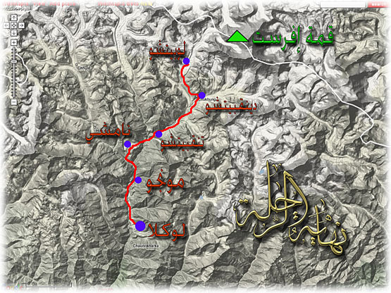 خريطة توضح خط السير من لوكلا إلى لوبوتشي وبعض أشهر القمم هناك
