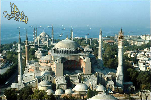مسجد أيا صوفيا وخلفه الشهير بالمسجد الأزرق ... والجدير بالذكر أن هذا المسجد صار مزاراً للسياح مع الأسف الشديد ... ولا شك أنه يعتبر من المعالم الإسلامية في تركيا رغم كونه حول من كنيسة إلى مسجد أو العكس