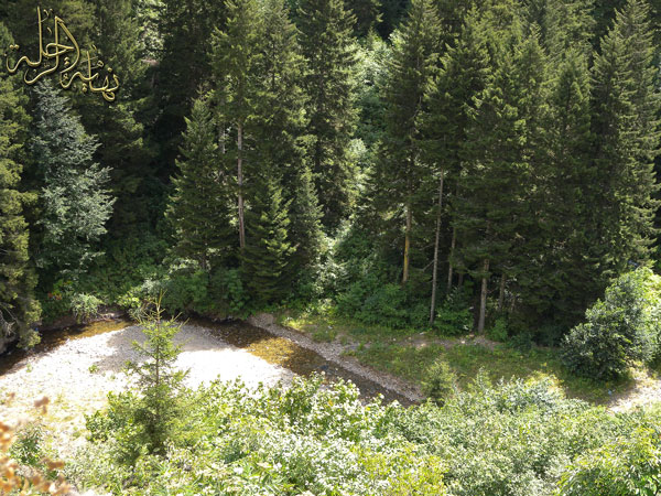 أشجار مخروطية يجري في وسطها جدول عذب