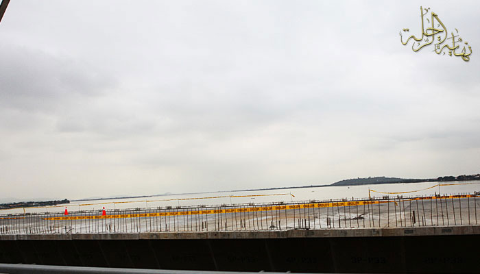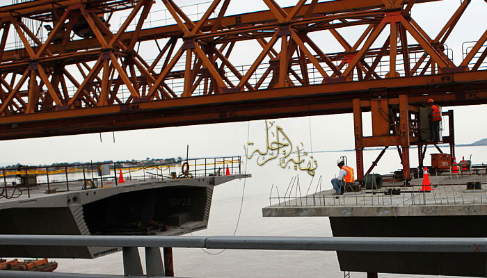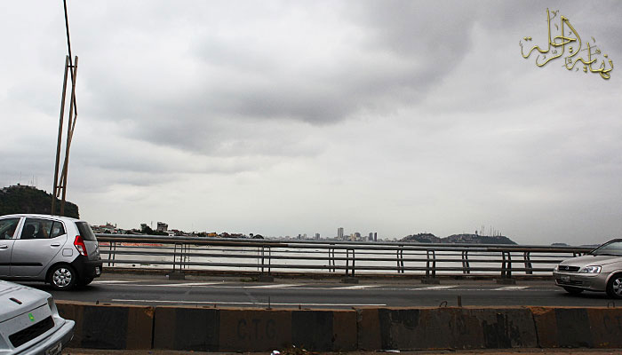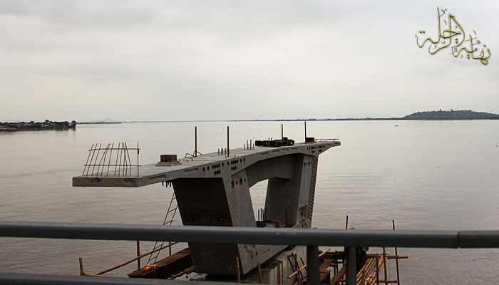صورة مقربة توضح الطريق الرئيس وجزيرة صغيرة في طرف النهر والجسر الآخر نحو المدينة