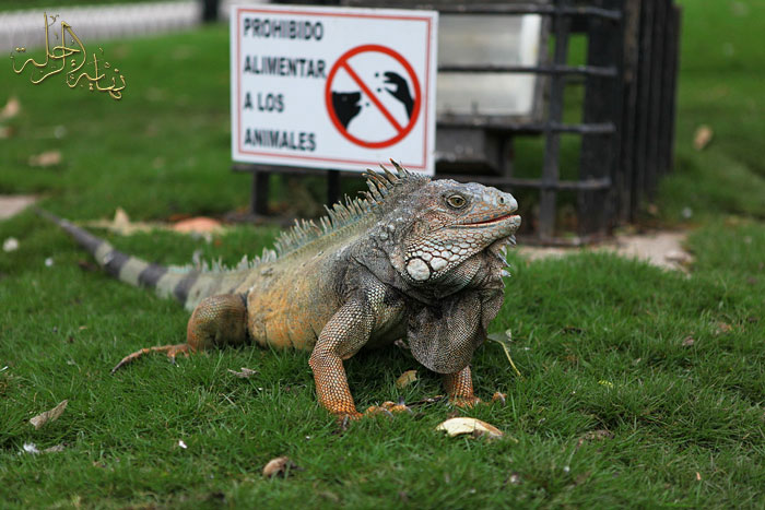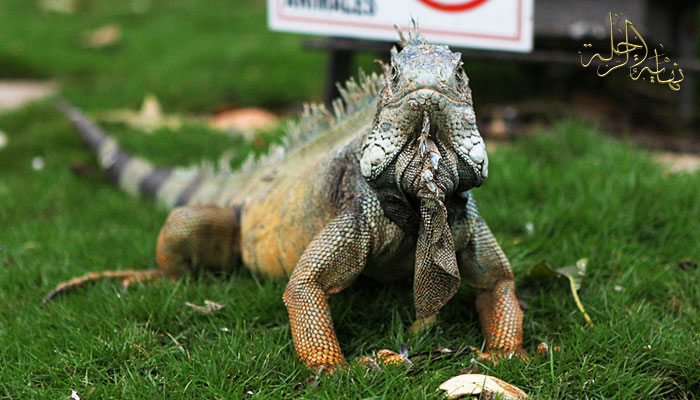 الإغوانا أحد الزواحف النادرة جلب من جزر الجلاباجوس يتمشى في الحديقة مستفيداً مما يرميه الناس من طعام