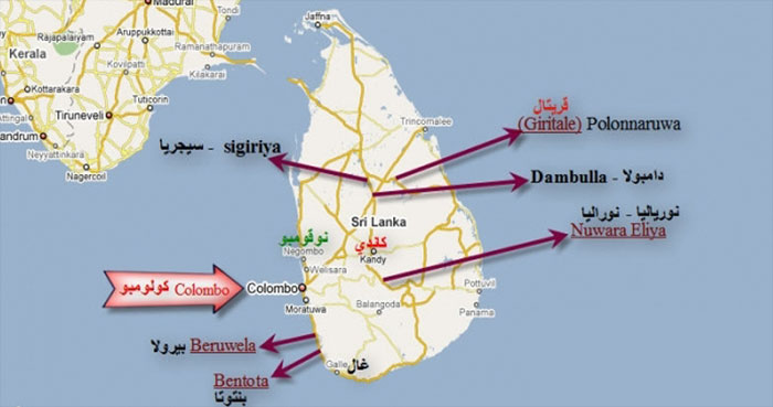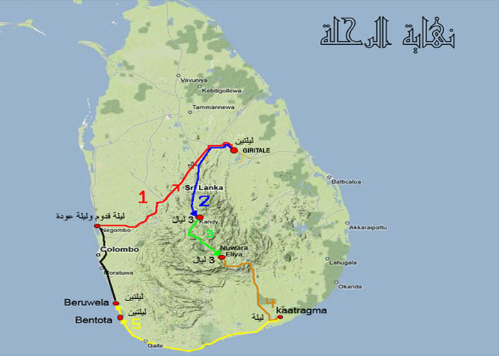 وكانت خطة الرحلة كما هو موضح على الخريطة أدناه خمسة مراحل ليلة في مدينة نيقمبو بحكم قربها من المطار وهي مدينة جميلة على ساحل المحيط . ليلتين في مدينة قيرتلا ، ثلاث ليال في كاندي وثلاث ليال في نوراليا وليلة في كاتراجما وليلتين في بنتونة ومثلها في بيرويلا وليلة في نقمبوا استعداداً للعودة. وقد قطعنا في الرحلة من بدايتها إلى نهايتها على الأراضي السريلانكية حوالي 1600كم تقريباً.